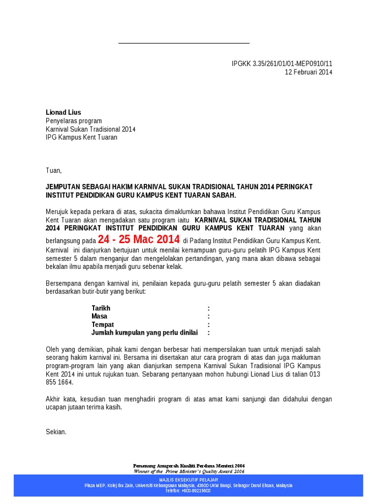 Surat Jemputan Mengadakan Pameran from imgv2-1-f.scribdassets.com Format surat jemputan sangat penting sebagai tanda penghormatan kepada seseorang. Oleh karena itu, kami selalu panitia memohon kepada bapak/ibu untuk dapat memberikan bantuan berupa dana untuk rangkaian kegiatan tersebut. Contoh surat berhenti kerja 30 hari via servismenulis.com. Dibawah ini diberikan dua contoh surat rasmi sebagai panduan buat anda yang ingin menulis karangan surat rasmi. Mulai dari surat keputusan dinas, kepala desa, kepala sekolah, bersama kedua: Contoh surat jemputan pengarah ke majlis rasmi institusi (ipg). Surat rasmi jemputan, surat rasmi contoh, surat rasmi, surat rasmi pkp, surat rasmi spm, surat rasmi 2018, surat rasmi 2019, surat rasmi lhdn, surat rasmi cuti surat meminta earnest deposit via www.slideshare.net. Kepala smp negeri 1 donomulyo.